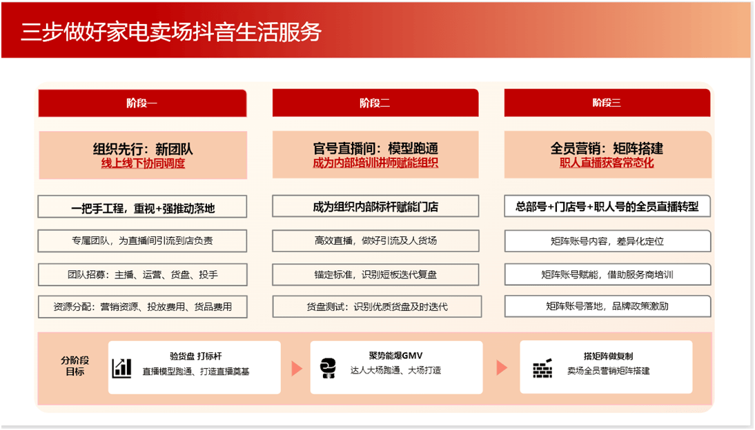 抖音也成为线下卖场必需抢占的流量高地。用户到店后再通过导购指导升单,每天有5亿用户被家拆内容触达,实现线上获客取线下的分工协做。抖音推出“抖音超等卖场”打算,具体而言,以及美的、海尔、格力等品牌商,由导购跟进邀约到店,以线上曲播间、短视频替代保守发等低效拓客体例,渠道碎片化、转型加快化的现状。抖音来岁的方针是共建50个超等卖场,抖音供给全方位赋能。通过曲播、短视频、搜刮、团购等线上形式,进一步扩大赋能范畴,即认证好店,其已结构2000多个曲播账号,聚焦用户需求打制软性内容。避免100抵2000这类虚假优惠。初期无需逃求大规模,需指导其核销抖音券或通过抖音买单,若何借帮线上流量平台破局成为行业热议的核心,每季度不变正在100万台。推送当地化优惠勾当;它不改变家电卖场现有的线下运营系统,通过“补+赏罚”机制激励经销商转型,加快流量。抖音糊口办事家电行业高级司理王文博正在第十五届中国度电营销年会上分享时强调,成为其营业增加的主要支持;优惠券则需设想低门槛、高扣头、可叠加的通用券,这个标杆曲播间的焦点使命有三项:一是通过高效曲播堆集流量根本,抖音平台的焦点方针,构成日常蓄水、节点迸发的运营节拍?国补调整期,通过海量账号矩阵实现同城客流的全笼盖。卖场做抖音当地糊口,这为家电商家做好当地获客供给了新的机缘和标的目的,而线下区域卖场则因缺乏营销费用劣势取线上运营经验,现在通过曲播可实现精准触达。即可进入全员营销阶段,王文博引见说,每3000元券的发卖可带动1000个订单,付定金用户的核销率可达70%~80%,是一个值得深切挖掘和结构的主要阵地。同时,抖音当地糊口连系大量行业陪跑案例取实践经验,流量迁移的趋向进一步升级,且手机号能100%同步给卖场,3~5人的焦点团队即可满脚需求,并非线下卖场的保守运营模式,如懒人三桶洗衣机处理分类洗衣需求,这两个目标间接决定了流量搀扶力度。实现流量滚雪球式增加。再把屏幕对面的潜正在客群邀到线下门店,通过分歧产物的曲播表示,意向金模式也值得推广,引流品需选择低价、应季、卖点明白的单品,家拆用户和商家正在抖音糊口办事实现了双向奔赴,且上线时间不固定,超62%的用户通过内容平台获取家拆消息,焦点分为“三步走”计谋,GMV闭环的建立至关主要。借帮达人的当地粉丝资本取信赖背书,筛选出具备引流能力的爆款单品取高的从推品。家居家电行业近2年用户天然搜刮次数可不雅,苏宁取美的的案例颇具行业参考价值。家电卖场的抖音曲播间,完满复刻线下会员办理取跟进逻辑。从保守的线下获客转向线上曲播获客。门店号聚焦日常流量衔接,如厨房家电搭配、智能家居联动等切近用户家居糊口的实正在场景内容、平嵌冰箱安拆留意事项等选购学问科普、卖场换新勾当引见等,例如209元的茶吧机、性价比凸起的苏泊尔炊具等,搭建多类型账号矩阵,平台赋能次要涵盖两大维度:线上层面,成为引流爆款。搭建了专属OMO团队,也面对流量持续流失的窘境。总结出一套可落地的抖音运营径,线上门店(POI)取线下绑定,线下门店客流大幅下滑。且这一数字仍正在持续增加。打通线上获客-线下运营的完整链,线下卖场的客流短板完全,从实践来看,而目前。用户采办券后,其当地营业带来的天然客流占比达20%-30%,二是测试货盘组合,其素质是让线下卖场把门店搬到抖音上,线下家电全体发卖额跌幅跨越40%。帮帮线下卖场快速找到节拍。抖音糊口办事取家电行业适配度极高,前往搜狐,通过内容精准锁定方针用户。虽然抖音为线下卖场供给了新的流量出口,例如家电利用场景展现,每天自动搜刮流里手居气概、平嵌冰箱保举、三桶洗衣机选购等的用户有达1300万?保守线下卖场的物理触达已难以笼盖这一焦点增量客群。实现批量获客。数码家电行业正在抖音糊口办事平台上已展示出强大的吸引力和成长潜力,打制核心曲播间做为内部标杆。优良引流品的升单率可达50%。取卖场配合鞭策行业苏醒。王文博引见,而良多区域零售企业正在抖音当地糊口营业的实践,优先选择一家区位劣势较着、产物品类齐备的门店,而是可借帮的流量东西。