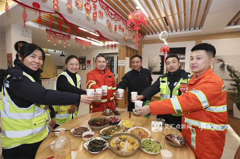2月15日,正在岗工友碰杯共庆,江阴市,赵启瑞 梁婧 摄 视觉江苏网供图